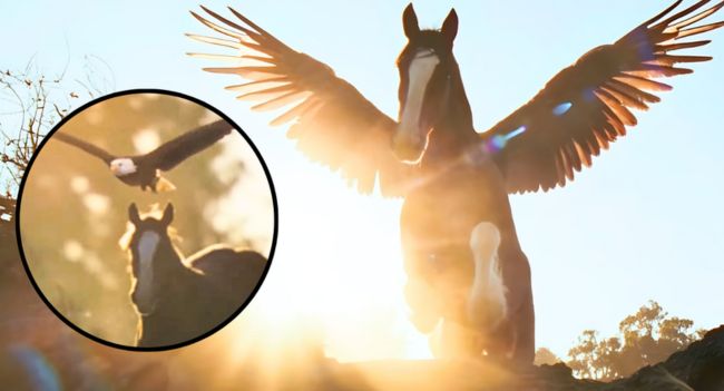 In an awe-inspiring moment near the end, the now-grown Clydesdale leaps over a fallen tree. A large set of wings spreads behind the magnificent animal as the sun beams down, making it look like a mythical Pegasus.